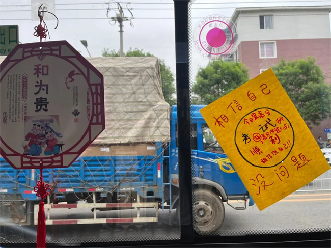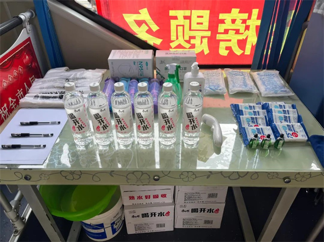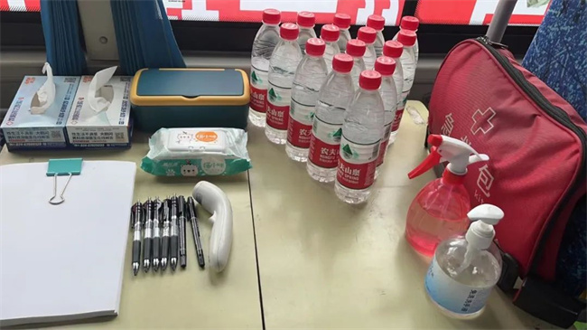 車內(nèi)雨傘、礦泉水、消毒液、消毒濕巾、口罩等一應(yīng)俱全,車身上還懸掛有“高考愛心服務(wù)車 217路為您服務(wù)”等字樣的條幅,這是張玲為了參與愛心助力高考活動(dòng),提前精心布置的車輛。