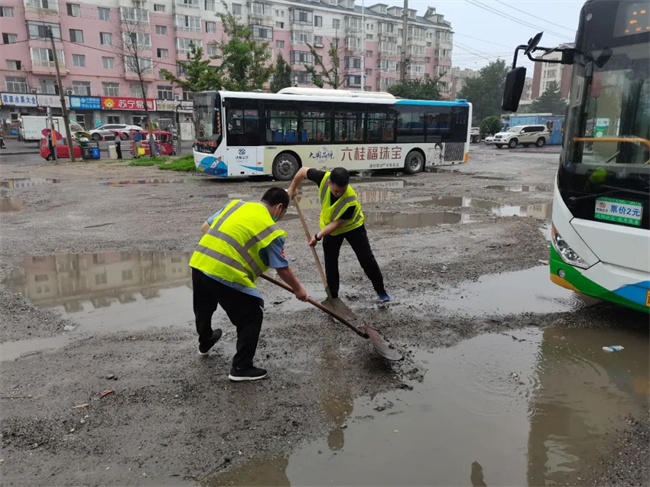 通利公司所屬車隊召開防汛會議,管理人員來到運營線路巡視,查看行車及積水情況,并對駕駛員進行出車前的安全提示。