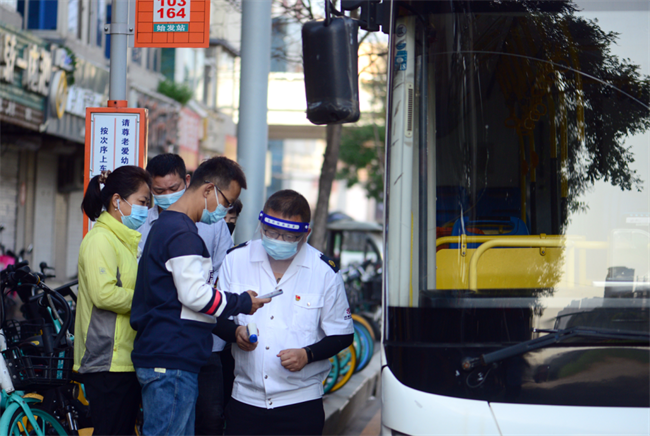 在長客西站264路、103路始發(fā)站,副隊(duì)長程玉磊配合公交駕駛員對乘客的健康碼、72小時核酸陰性證明、規(guī)范佩戴口罩、測量體溫等工作進(jìn)行檢查,廣大乘客主動配合。