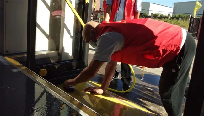 通運(yùn)公司志愿服務(wù)隊(duì)來到239路車隊(duì),細(xì)化防控措施,在公交停車場(chǎng)對(duì)乘客候車區(qū)進(jìn)行不間斷消毒,同時(shí)協(xié)助公交駕駛員嚴(yán)格實(shí)行公交車返場(chǎng)后的集中消毒及車輛通風(fēng)、清潔等工作,特別是對(duì)車廂內(nèi)座椅、扶手等乘客易接觸的部位進(jìn)行深度消殺,做到不留死角、不留盲區(qū),全方位保障乘客出行安全。