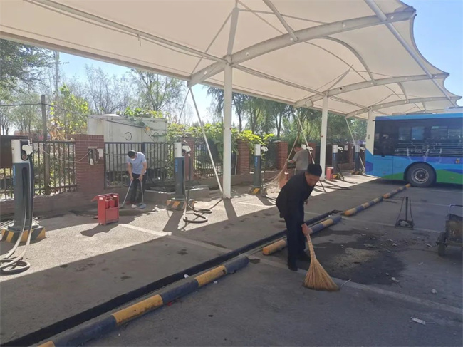 在活動現(xiàn)場,黨員干部沖鋒在前,大家充分發(fā)揮團隊精神,齊心協(xié)力,干勁十足,彰顯奮勇當(dāng)先的風(fēng)貌。這邊拿著打掃工具對場站院內(nèi)的枯枝落葉、垃圾等進行全面清理,那邊拿著洗車槍對站房的玻璃及地面進行清潔與沖刷,不留死角。經(jīng)過兩個小時的“奮戰(zhàn)”,場站被清理得干干凈凈,整體面貌煥然一新。