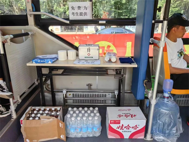 “黃河服務(wù) 千家萬戶”“助力考生 金榜題名”等醒目的祝福標(biāo)語掛滿了車身,在車廂內(nèi)準(zhǔn)備了急救包、風(fēng)油精、暈車藥、創(chuàng)可貼、口罩、礦泉水、雨傘、報(bào)紙等物品,應(yīng)有盡有,供大家隨時(shí)取用。