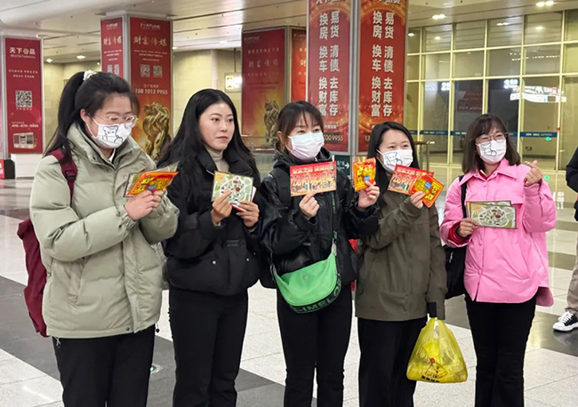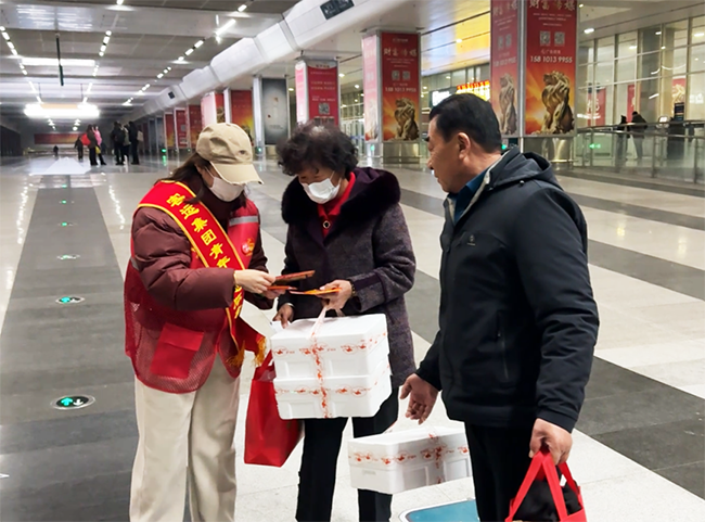 活動中,團員青年及志愿者在沈陽南站出站口、地鐵口及公交樞紐站服務(wù)臺向廣大乘客發(fā)放“沈陽最美網(wǎng)紅打卡地圖”DM傳單及暖寶寶。
