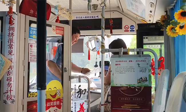 260路四星級駕駛員繆立眾早早來到工作崗位,做好出車前各項準(zhǔn)備工作的同時,還將提前準(zhǔn)備好的五彩繩、香包、葫蘆等寓意平安、健康的小禮物擺放在駕駛室。每到一站,他都起身微笑著向上車的乘客送上祝福,并將小禮物贈送給每一位乘客。收到祝福的乘客們充滿了驚喜和感動,紛紛豎起大拇指,對這位駕駛員的暖心舉動贊不絕口。