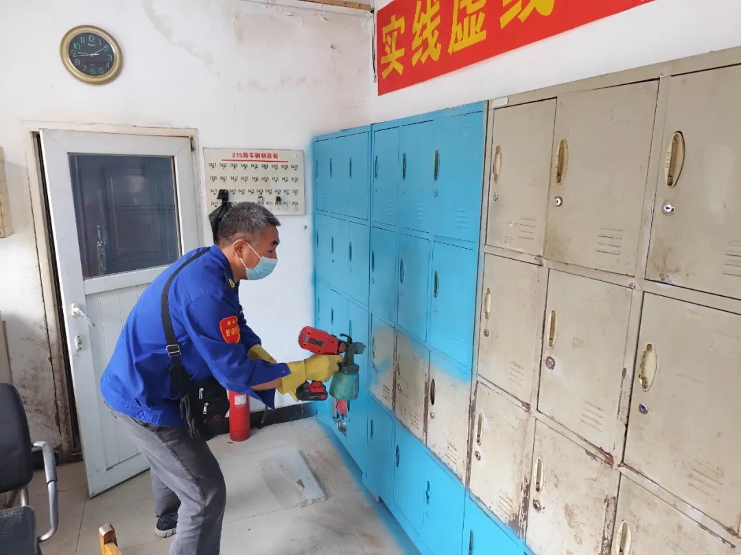 場面五:215路駕駛員陳守春利用自己的休息時間,帶來噴漆及工具,為大家的更衣柜穿了一件嶄新的“外衣”,美化車隊(duì)環(huán)境的同時,又增添了濃郁的節(jié)日氣氛。