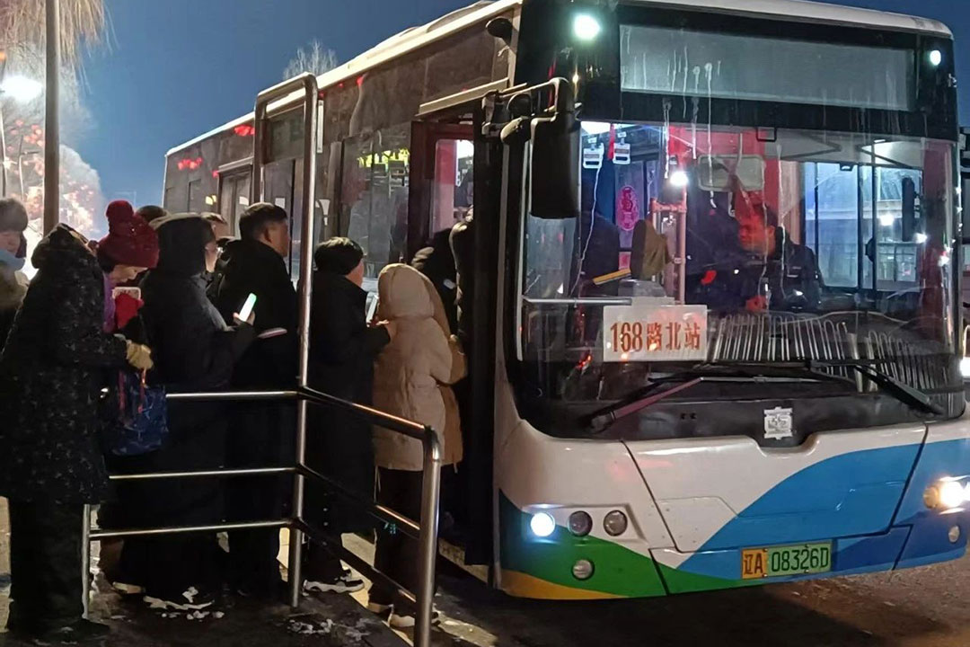 在219路大二臺子公交站臺,一位拄拐老人正在志愿者的攙扶下平穩(wěn)登車;寒風中,身穿紅馬甲的工作人員細心擦拭著候車長椅;車廂里,...