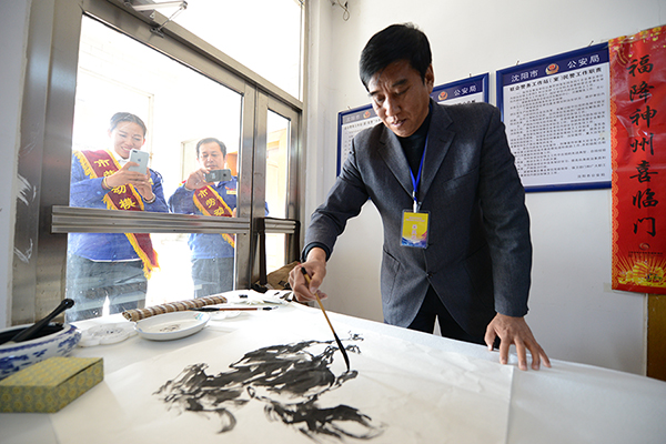 文藝演出后,書畫藝術(shù)家們與集團(tuán)公司勞動(dòng)模范、星級(jí)駕駛員在通利公司一樓大廳進(jìn)行了書畫藝術(shù)交流,現(xiàn)場(chǎng)展示了藝術(shù)家書法、繪畫創(chuàng)作全過(guò)程,讓駕駛員們親身感受書畫創(chuàng)作的藝術(shù)魅力。