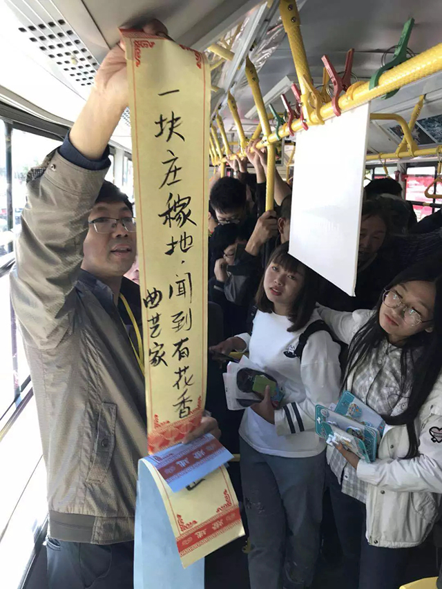 9月22日上午九點(diǎn),藝術(shù)家們來到130路渾南終點(diǎn)站,在民間文藝號(hào)和美術(shù)號(hào)公交車上為乘客準(zhǔn)備了民俗與文藝活動(dòng)。燈謎活動(dòng)由和平區(qū)民協(xié)燈謎學(xué)會(huì)主席蘇穎親自上陣主持。謎面剛一亮出,就受到了乘客的歡迎,車廂前后的乘客都把注意力集中過來。燈謎作品不但涉及中秋、國(guó)慶以及社會(huì)主義核心價(jià)值觀、中國(guó)夢(mèng)等主題,還兼有各類百科謎作。比如:“中秋大派送(三字?jǐn)?shù)量詞)一一十五發(fā)”、“中國(guó)夢(mèng)初現(xiàn)(廣西地名)一一玉林”、“書里寫得很清楚(社會(huì)主義核心價(jià)值觀詞語)一一文明”等;和交通相關(guān)的如:“雙雙上車來(字)一一輟”;近期熱點(diǎn)的如:“一塊莊稼地,聞到有花香(曲藝家)一一單田芳”等等。雖然謎作難易有異,但經(jīng)過啟發(fā),均能被乘客猜出,個(gè)別謎還能夠出現(xiàn)被秒殺的狀況。好多謎在被猜中后,都傳來乘客會(huì)心的笑聲,月餅等獎(jiǎng)品也受到大家的喜愛,弘揚(yáng)燈謎文化的同時(shí)也讓乘客們?cè)鲩L(zhǎng)了百科知識(shí)。