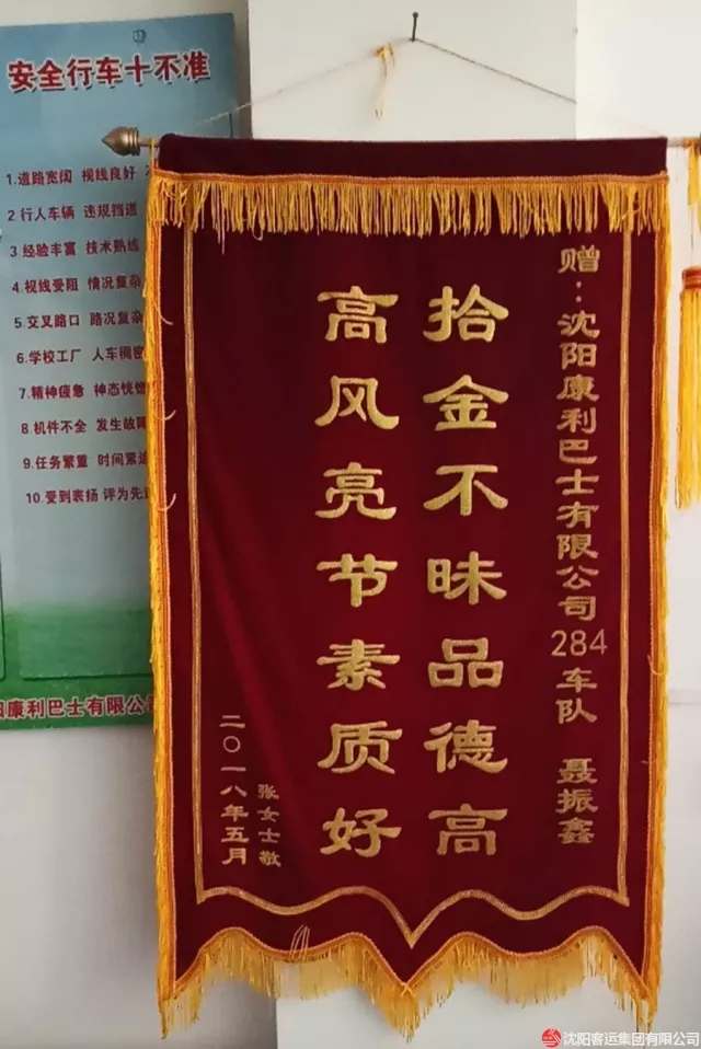 無獨有偶,還是284路車隊。5月10日,駕駛員聶振鑫在檢查車輛衛(wèi)生時,發(fā)現(xiàn)一部筆記本電腦被遺落車內(nèi),由于還要繼續(xù)行車,來不及尋找失主,便把電腦交給了車隊工作人員。失主發(fā)現(xiàn)自己電腦丟失后,抱著試試看的態(tài)度來到284路車隊,令她沒想到的是,電腦被細心的駕駛員撿到了。經(jīng)過工作人員核實,電腦的確是這位失主所有。失主對駕駛員拾金不昧的行為表示感謝,想要當(dāng)面酬謝,但被聶振鑫婉言謝絕了。對于失主的感謝,聶振鑫說:“這只是我的舉手之勞,公司經(jīng)常教育我們,拾到物品后應(yīng)該怎么處理,我只是用實際行動去傳遞社會正能量?!笔潞螅е魉蛠礤\旗表示感謝。