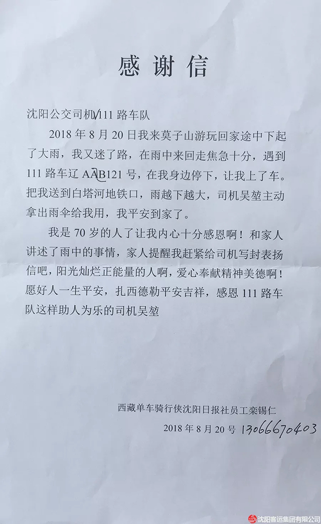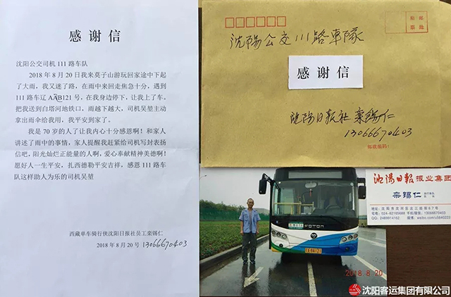 8月20日下午,沈陽突降大雨,鑫暢巴士v111路駕駛員吳堃駕駛公交車駛至莫子山公園附近時,看到一位老人在路邊徘徊,全身已被雨水澆透。雖然老人沒有在站點位置等車,但吳堃見老人狀態(tài)不佳,于是將車??吭诼愤?。走近后見老人臉色慘白,嘴唇已經(jīng)沒了血色,便關切地詢問道,老人稱自己迷了路,找不到回家的方向了。于是吳堃第一時間將老人帶回了車隊,找來干毛巾把老人身上的雨水擦干,喝了熱水后老人逐漸緩了過來。原來,老人姓欒,家住五愛街,到莫子山公園游玩,突然下起了雨,他趕緊往山下跑,卻因新修路不熟悉路形而迷失了方向。