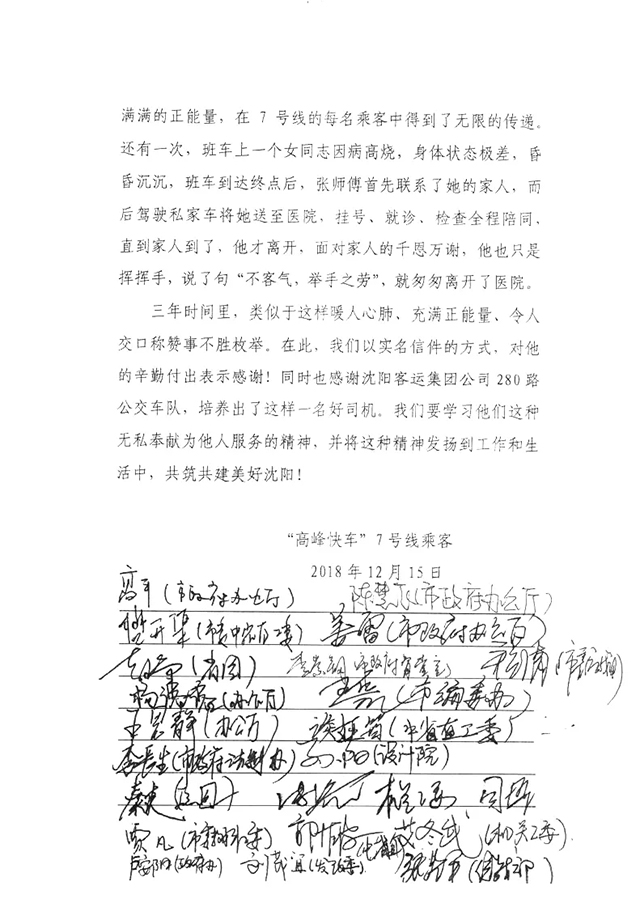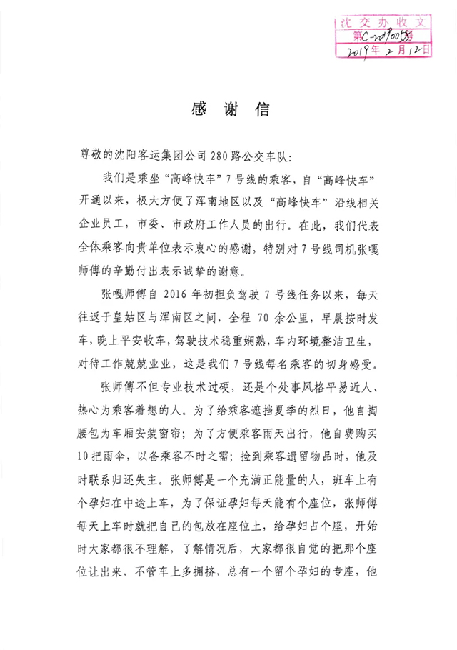 信的內(nèi)容是,贊揚(yáng)280路駕駛員張嘎的好人好事。為乘客提供了防曬窗簾、雨傘等用品,而且工作中拾到的錢包、手機(jī)、公文包等重要物品都能做到拾金不昧。對(duì)待持老年證及孕婦乘客主動(dòng)幫其找座位。對(duì)待病患人員則用心照顧,盡力滿足他們的條件和要求。不僅如此,每天利用休息時(shí)間多次對(duì)車輛進(jìn)行清掃和檢查,發(fā)現(xiàn)車輛隱患及時(shí)排除,保證安全運(yùn)營。張嘎積極工作、文明駕駛、樂于助人、堅(jiān)持365天微笑服務(wù),他的工作熱情感染著身邊每一名同事,同時(shí)讓車上的乘客也真實(shí)感受到他優(yōu)質(zhì)的服務(wù)。作為公交一份子,始終堅(jiān)持“乘客至上”的原則。多年來,深深懂得肩上的重任,雖然沒有驚天動(dòng)地的光輝業(yè)績(jī),卻有任勞任怨、勤勤懇懇的敬業(yè)精神。